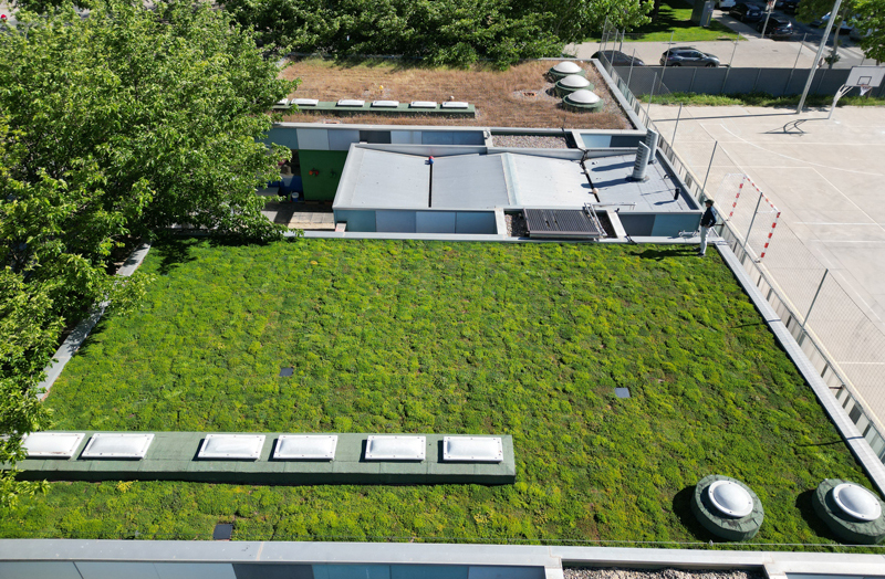 Exitosa cubierta verde semiextensiva de un colegio situado en el denso Ensanche del centro de Barcelona. Está debidamente mantenida y parcialmente vigilada. Proporciona numerosos servicios ecológicos: alimentos de origen local gracias a un huerto, datos climáticos mediante una estación meteorológica, biodiversidad a través de un hotel de insectos, energía limpia producida por paneles solares, reciclaje de agua gracias a un sistema de recogida, almacenamiento y reutilización del agua de lluvia. Estos servicios contribuyen tanto a la naturalización de la ciudad como a la educación medioambiental de los escolares.