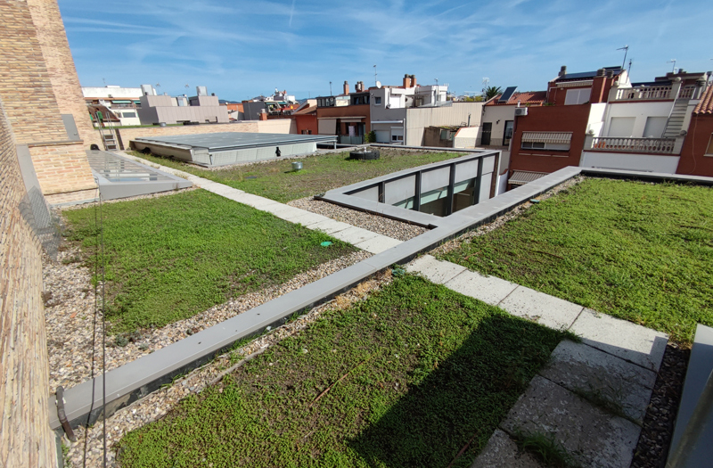 Exitosa cubierta verde semiextensiva de un equipamiento colectivo para la integración de discapacitados psíquicos situado en una zona en reestructuración urbana de Barcelona. Se mantiene y monitoriza parcialmente. La cubierta mejora la biodiversidad del barrio, atrayendo insectos, aves y pequeños reptiles. Almacena CO2 y partículas en suspensión responsables de la contaminación atmosférica. Disminuye el efecto isla de calor y produce ahorros energéticos gracias a un mejor comportamiento térmico del edificio.